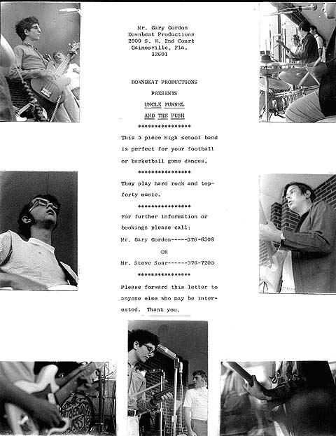 Above is an unbelievably rare promotional poster of Uncle Funnel and The Push (that's right, folks), courtesy of Gary Gordon, showing my new, streamlined look, a Sears Neatnik blue tapered shirt and my best Sears jeans.