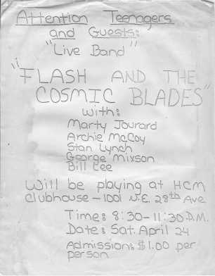 At some point in this part of my life, I hooked up with a guy called Stan Lynch and some other players and we came up with a one-shot band called Flash and the Cosmic Blades . Little did the guests at our one performance know, but two members of this ridiculous band would be in the Motels and Tom Petty and the Heartbreakers. But then again, neither did we. All I remember about this band was that it was basically a joke, and that we did a jazz version of "Wipeout" with me playing the melody on flute, and another song called "Spaceman Blues," an early original featuring me on really crude alto sax with the reverb cranked way up to simulate Outer Space: