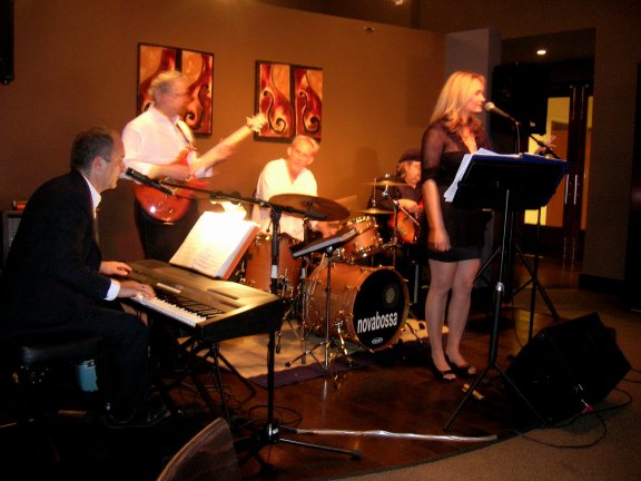 Well, nostalgia is great but what about the present? Just thirty short years after I was in Southpaw, I have formed a bossa nova band called novabossa. Featuring the stunning vocals of Brazilian singer Marcia Tavora, we have begun playing in the Seattle area. We wear all black and play mostly songs by Brazil's greatest composer, Antonio Carlos Jobim. This music has the most sophisticated chord progressions I've ever played. Heck, I didn't even know there was such a thing as a F sharp minor seven flat five until recently, although for sheer wistfulness nothing beats ending a song with a nice major seventh sharp fourth. I keep thinking I'll use up all the music in the world but it hasn't happened yet. Find out more at novabossa and you can even hear our four-song demo. Trust me, it's good.
